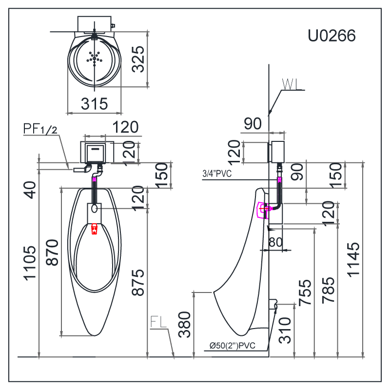 TP.HCM - Hotline: 0906.277.298 - 0939470296. Bệ Tiểu Nam (Treo Tường) - U0266, thoát ngang.