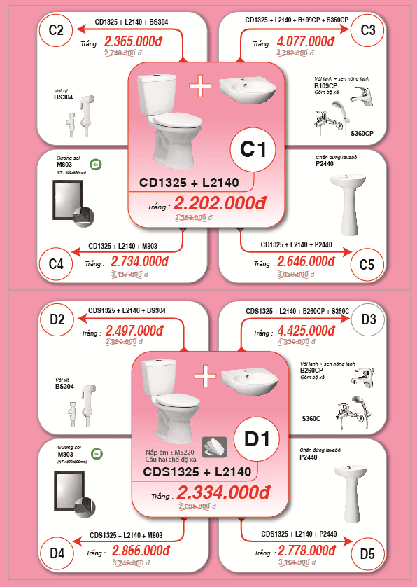 - Đặc biệt hơn, quý khách hàng mua cùng bộ bàn cầu + Lavabo quý khách sẽ được giảm giá từ 25% đến 35%. Còn nhiều hơn thế...