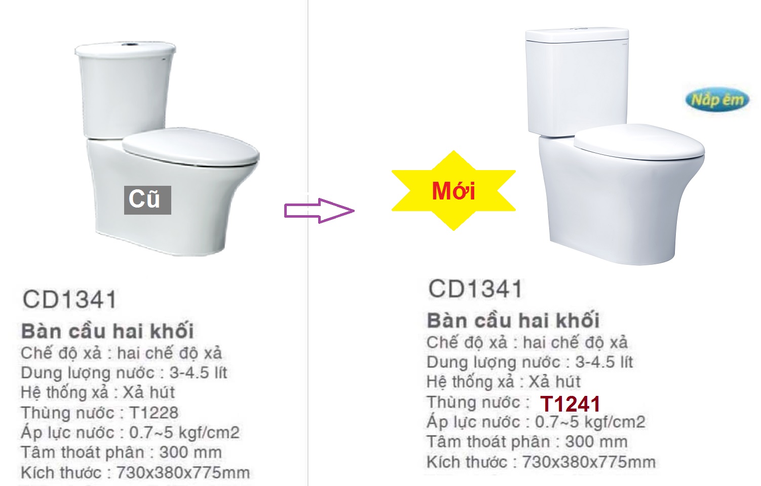 Kể từ tháng 10/2018, Caesar thay đổi mẫu bàn cầu hai khối nắp êm CD1341. Cụ thể thay két nước T1228 thành T1241, từ két tròn thành két vuông đẹp hơn. Giá cả vẫn không thay đổi, chi tiết như sau: