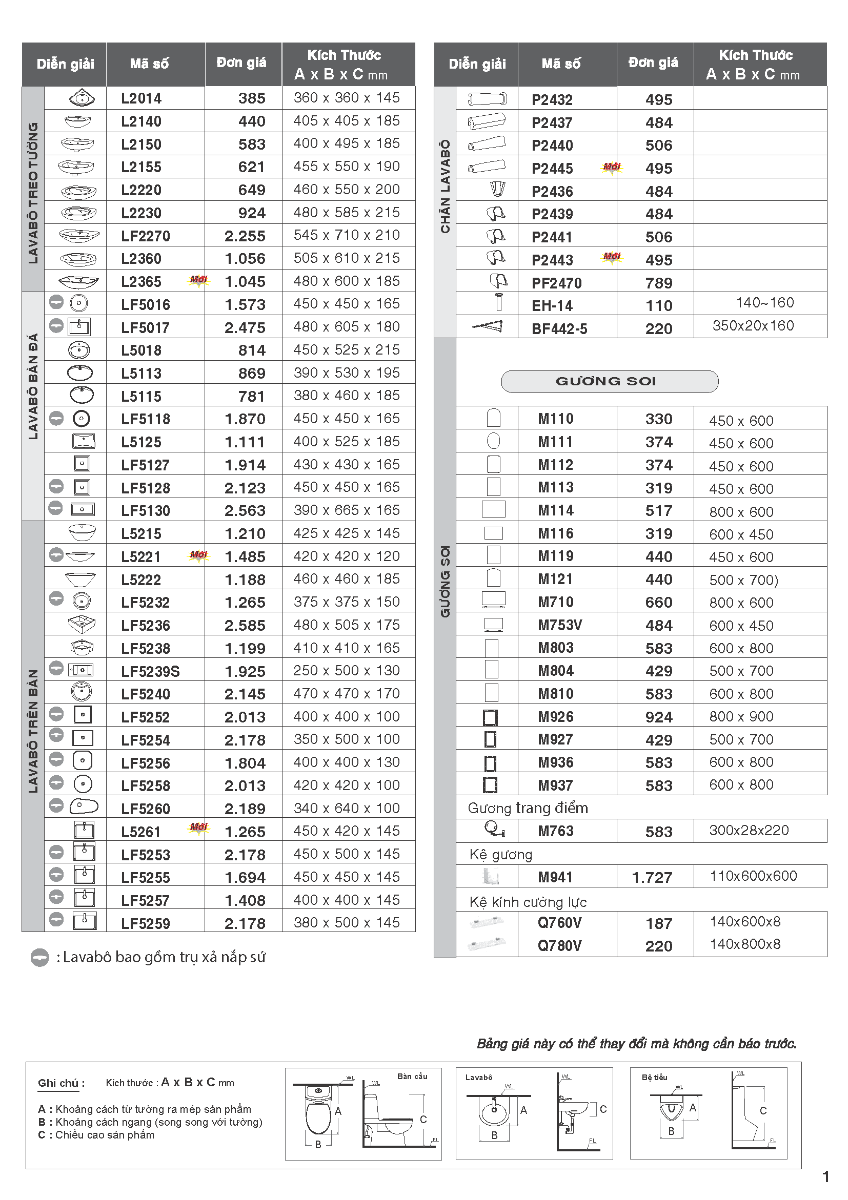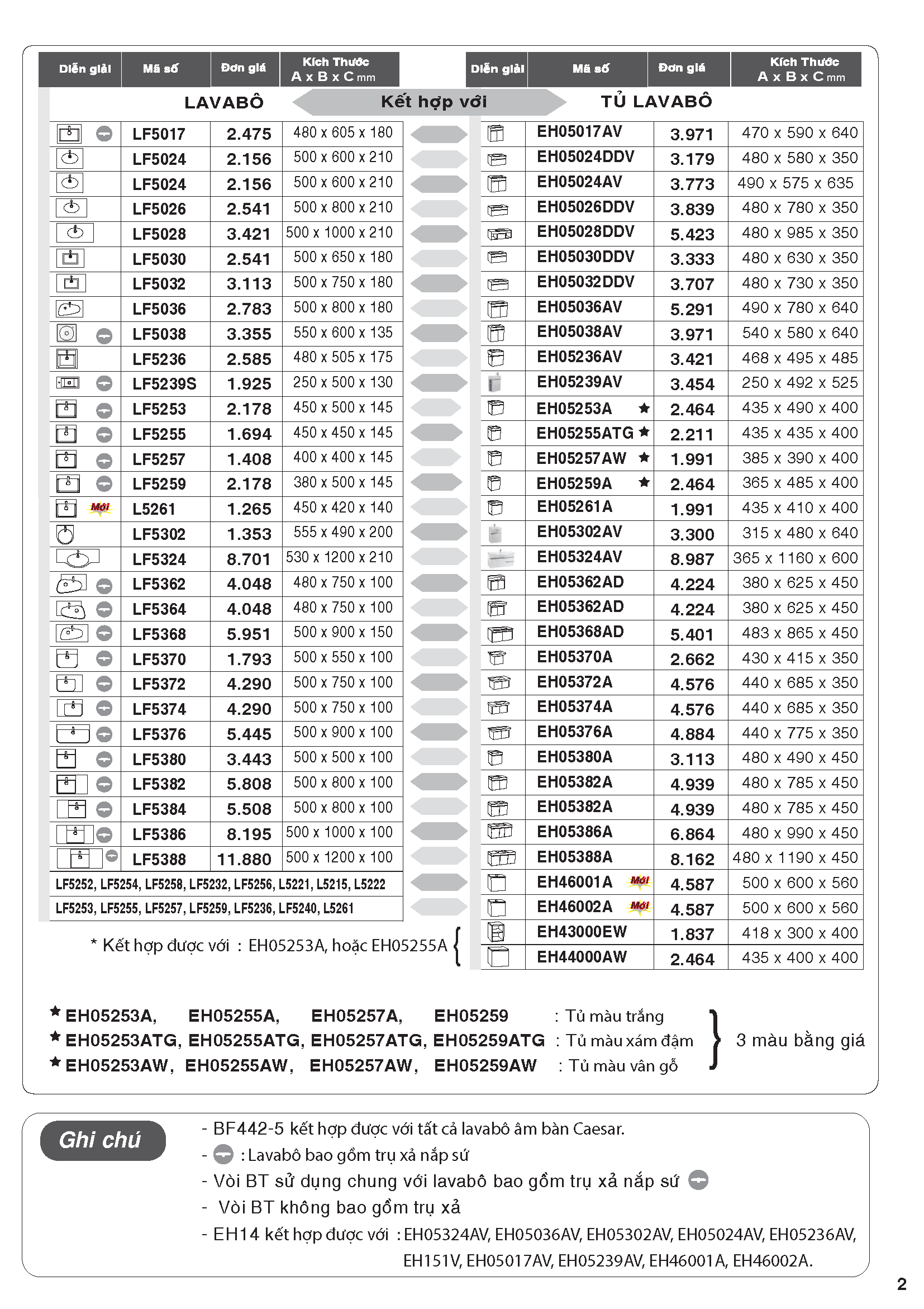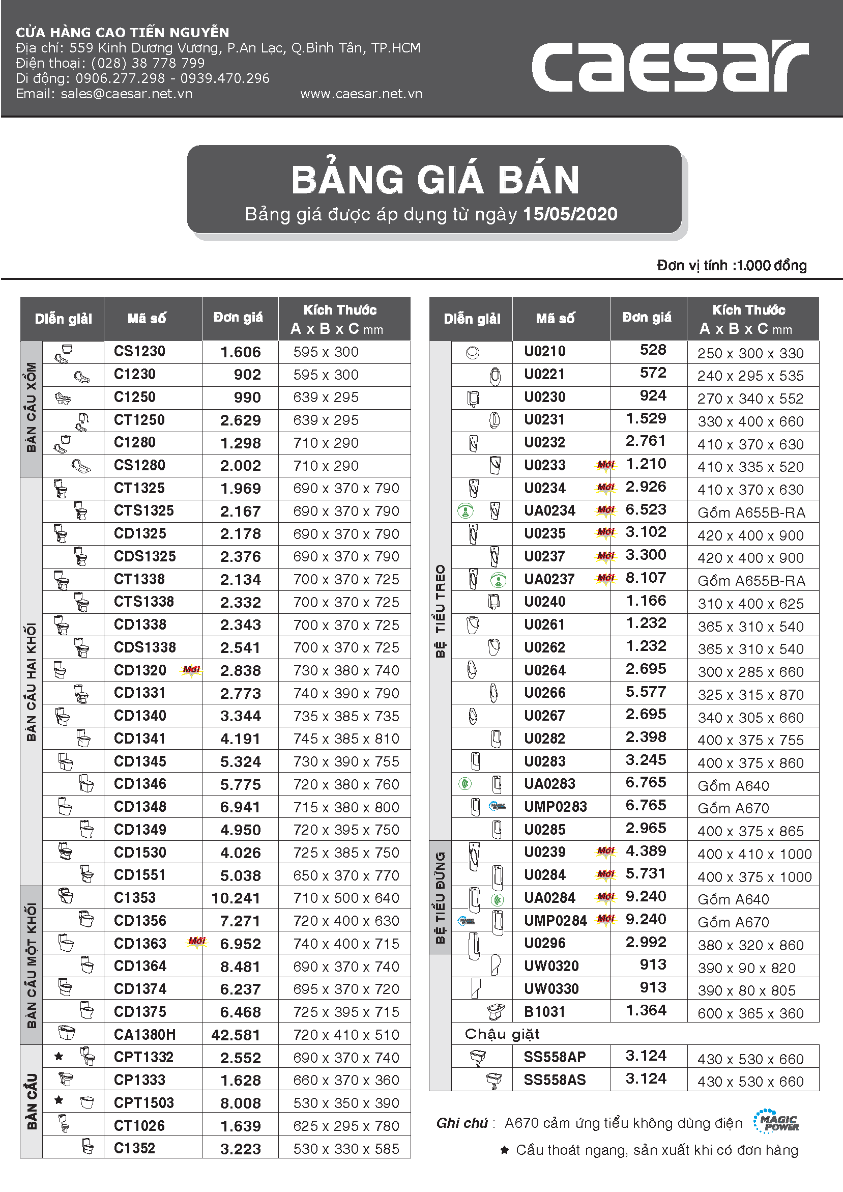 Bảng giá bán thiết bị vệ sinh Caesar 15-05-2020
